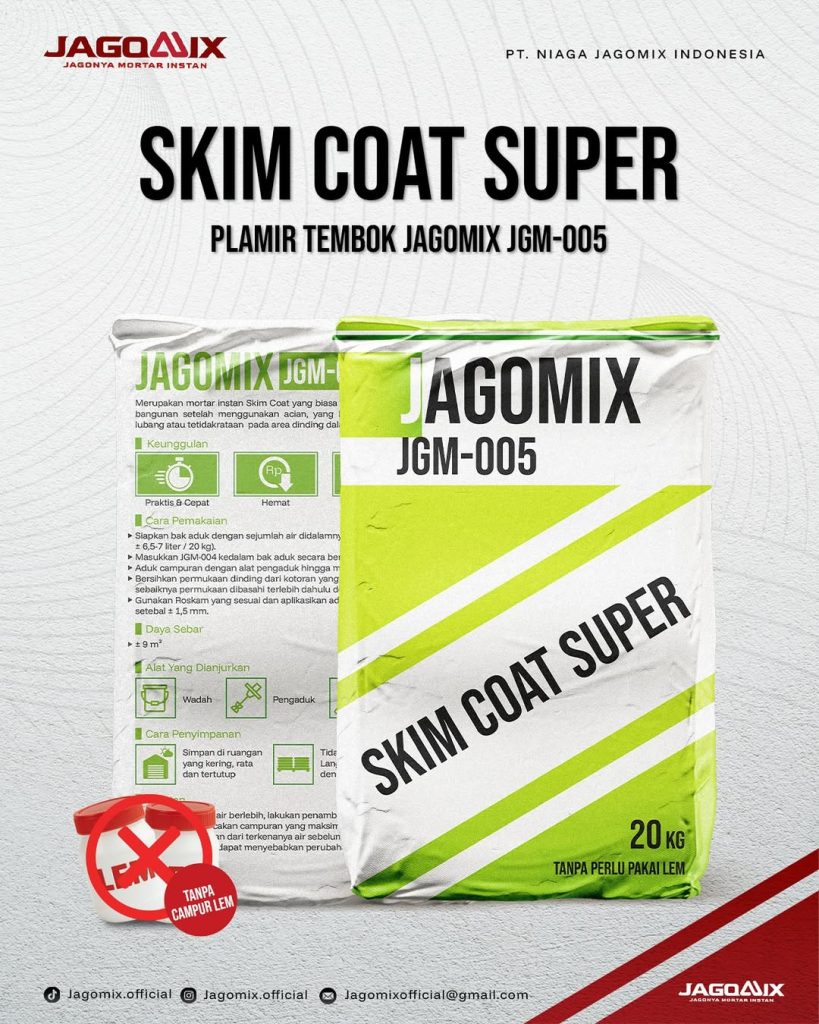 Skim Coat Super JGM-005 Plamir tembok premium yang bikin permukaan pada dinding luar jadi super halus, rapi, dan siap finishing. Cocok banget untuk menutup retakan, lubang, atau ketidakrataan sebelum pengecatan, biar hasilnya maksimal dan tahan lama.